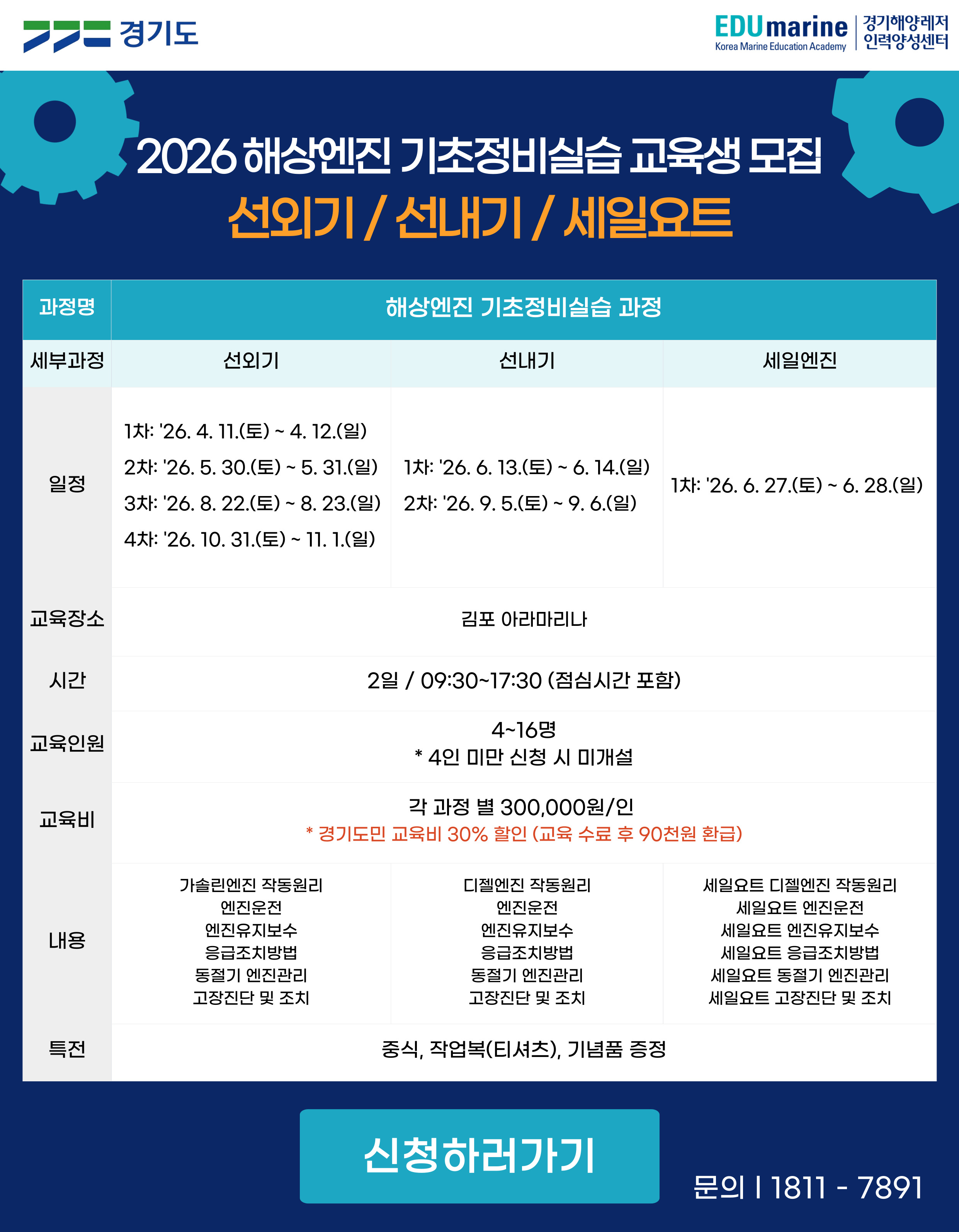 경기해양레저인력양성센터, 해상엔진 자가정비 교육생 모집
